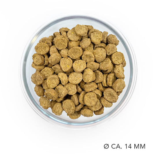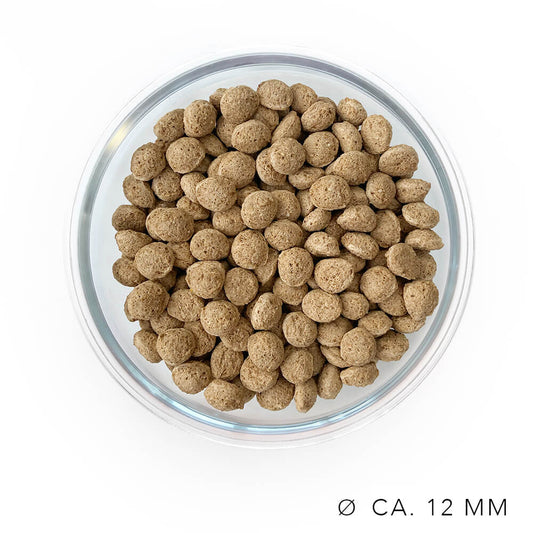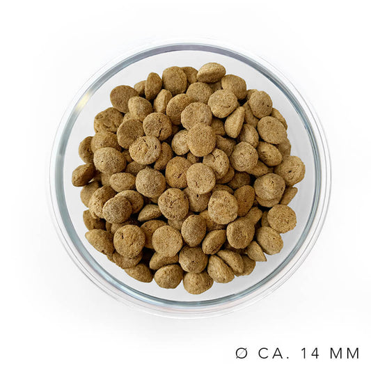Unser Trockenfutter steht für Qualität und sorgfältig ausgewählte Zutaten, die deinem Hund ein gesundes und glückliches Leben ermöglichen. Jede Sorte entwickeln wir mit höchster Sorgfalt gemeinsam mit Tierärztinnen, um sicherzustellen, dass es die Bedürfnisse deines Hundes vollständig abdeckt. Dein Hund liegt uns am Herzen und es ist unser Ziel, möglichst vielen Hunden ein passendes und unwiderstehlich leckeres Futter anzubieten.